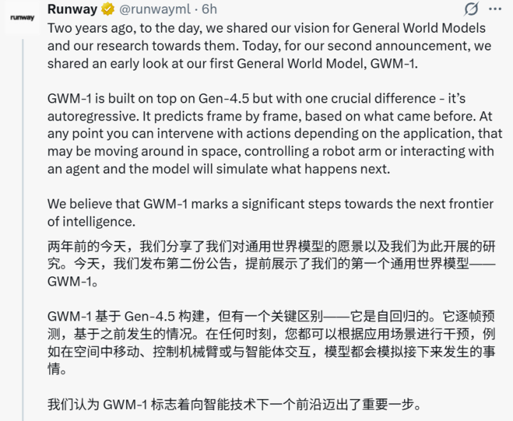 GWM-1:Runway的首个通用世界模型,这是理解物理世界运行规律的基石。
