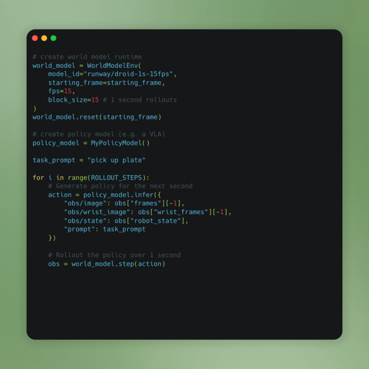策略模拟评估:无需部署到真实机器人上,你可以直接在Runway的世界模型中测试策略模型(如OpenVLA或OpenPi这类VLA模型)。这种方式更快、可复现性更强、安全性也更高,同时仍能提供逼真的行为评估。